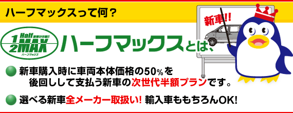 ハーフマックスで新車を購入した場合車両本体価格の50%を後回しできるので、頭金なしでも新車をラクに購入する事が可能。 |